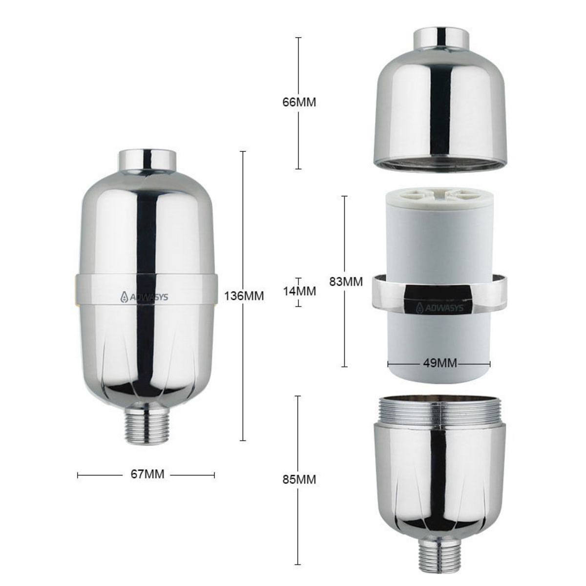 Duschfiltret Adwasys Vitalfresh-01 renar kranvattnet till optimala nivåer för hud och hår. 15-stegsfiltreringen tar inte bara bort föroreningar utan balanserar även vattnets pH-värde och mjukhet. Dessutom ger C-vitamin naturlig näring och återfuktar huden, vilket minskar torrhet. Filtrets mineraler ger huden allsidig näring. Det mjuka, vitaminberikade, mineralrika och pH-balanserade duschvattnet är skonsamt mot hårets naturliga färg, men särskilt mot färgat och behandlat hår, och hårfärgen håller sig ljus längre.