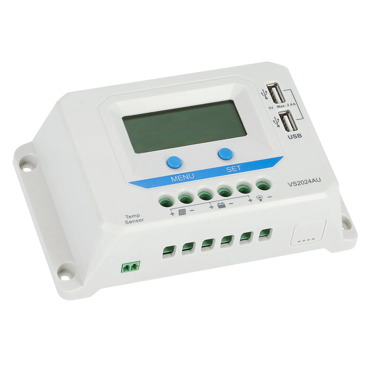 - Styrenheten kan programmeras med flera inställningar via displayen och knapparna (t.ex. batterityp, paneleffekt etc.)