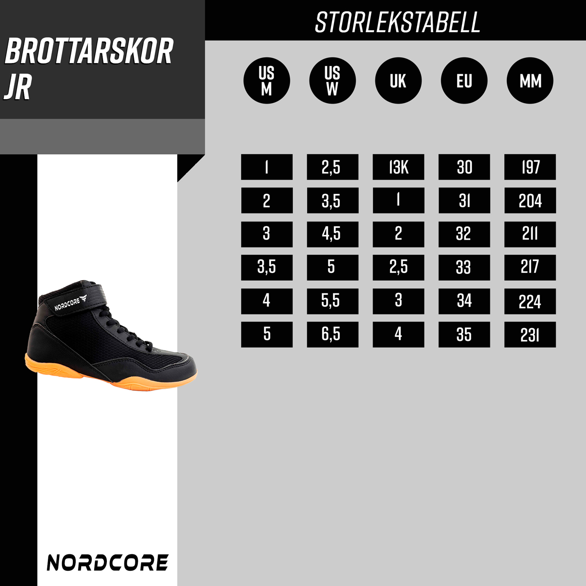 Nordcore brottningsskor för ungdomar är lätta, hållbara och pålitliga. Brottarskon är gjord av syntetiskt läder och mjukt nät, och ger en bekväm känsla och hållbarhet. Gummisulan är slitstark och ger skon den nödvändiga styvheten. Sulan är något upphöjd på skosidorna vid kudden och hälen för att säkerställa optimal dragkraft även vid fotrörelse i sidorna. På grund av den lätta gummisulan är den också väl lämpad som en inomhussko för andra sporter som innebandy eller skolgymnastik. Kardborrbandet håller snören snyggt dolda och förbättrar passformen på skon.