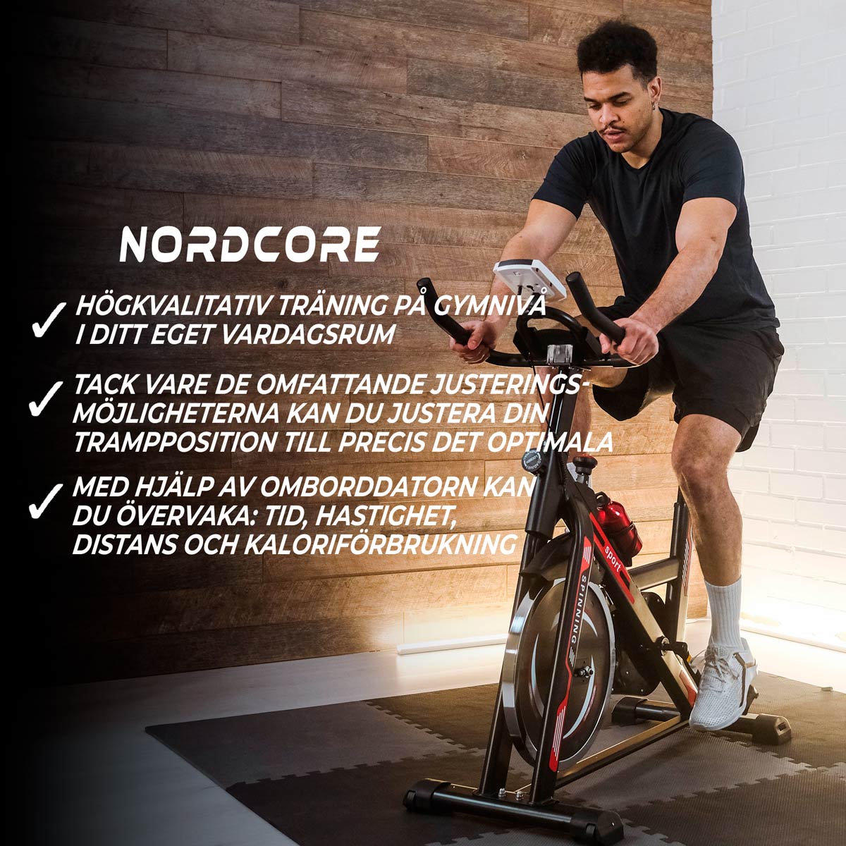 Nordcore spinningcykel 1300! Spinningcykeln möjliggör träning på samma nivå som i gymmet till exempel i ditt egna vardagsrum. Cykelns säte kan enkelt justeras till din optimala höjd så att du får ut det mesta av din träning.