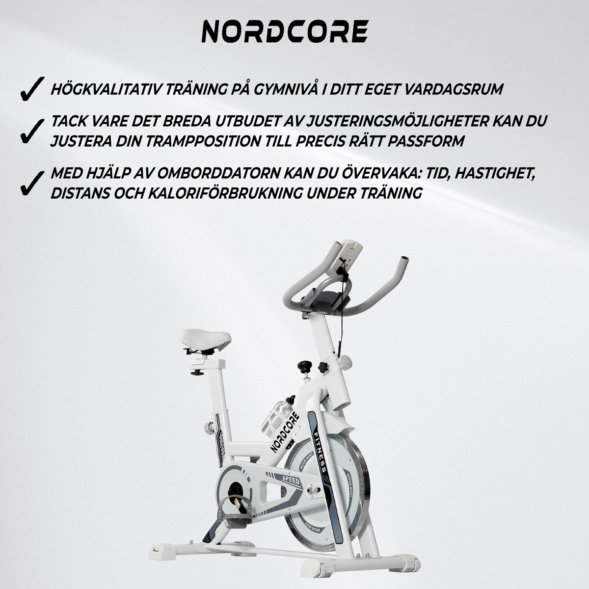 Nordcore spinningcykel 1300! Spinningcykeln möjliggör träning på samma nivå som i gymmet till exempel i ditt egna vardagsrum. Cykelns säte kan enkelt justeras till din optimala höjd så att du får ut det mesta av din träning.