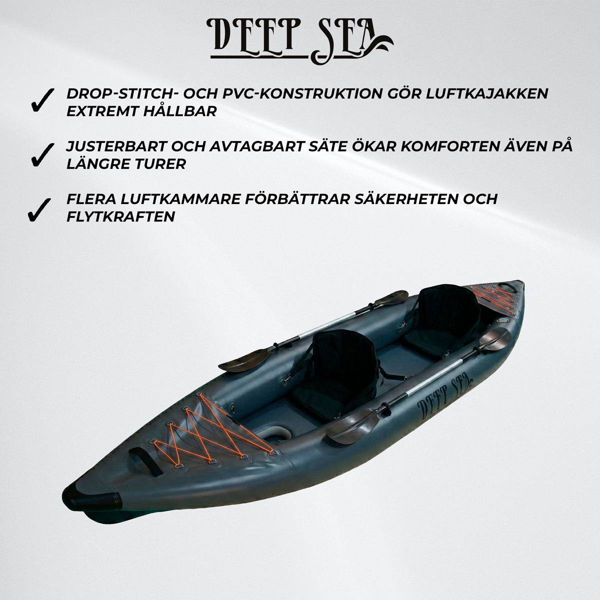 <p>Utforska vattnet med stil och förtroende med Deep Sea Uppblåsbar Kajak Premium DS Double 415cm. Oavsett om du är ute efter lugna paddlingar eller spännande äventyr, levererar denna kajak exceptionell prestanda och hållbarhet. Tillverkad av högkvalitativt Drop-stitch material och förstärkt PVC, klarar den av tuffa utmaningar och erbjuder överlägsen styvhet och hållbarhet. Den är designad för att ge maximal stabilitet och utmärkt spårning i vattnet, vilket gör att du kan känna dig trygg och njuta av varje paddeltag. Med sin lätta konstruktion och snabba uppblåsbarhet är den perfekt för alla former av vattenäventyr. Ta med en vän och upplev naturen på ett helt nytt sätt med Deep Sea Uppblåsbar Kajak.</p>