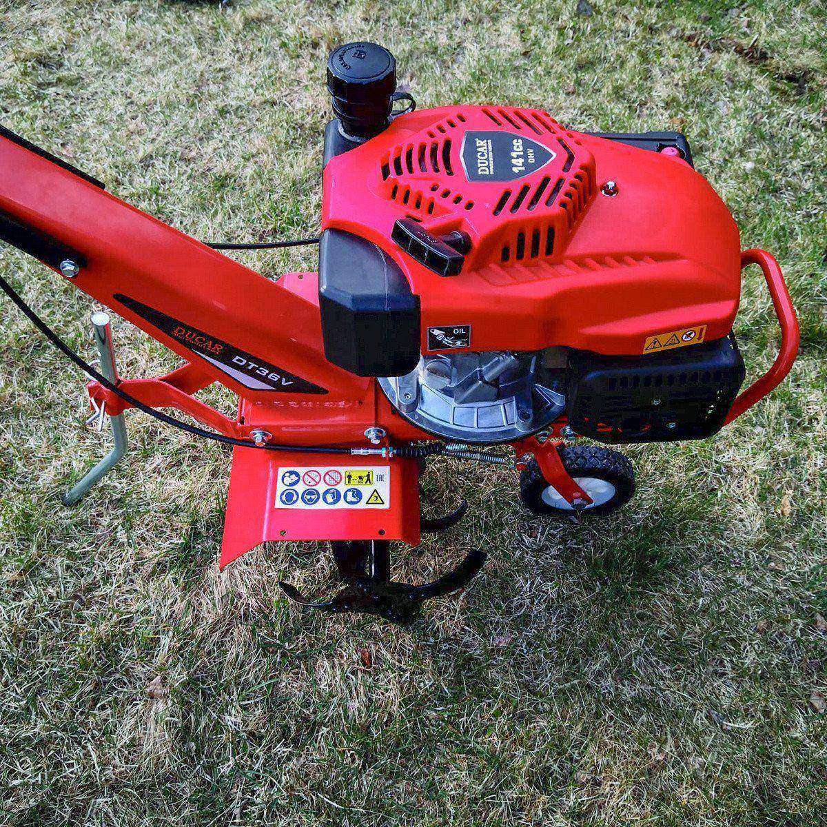 Högkvalitativ Ducari kompakt trädgårdsfräs. Fräsmaskinens stödhjul hindrar maskinen från att sjunka till marken och stödjer enheten under användning. Manuell start. Optimal arbetsställning och tillräckligt brett arbetsområde.