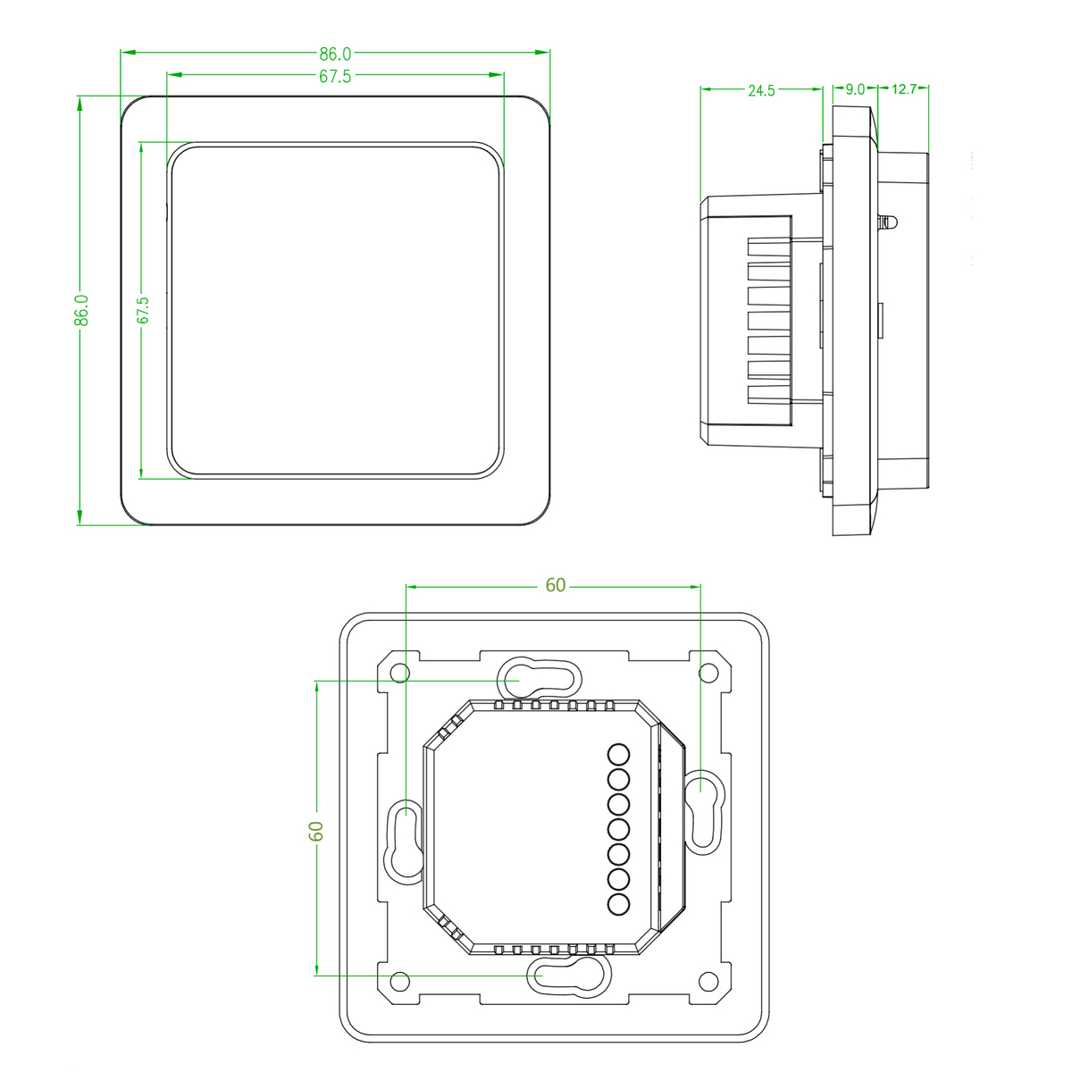 Kombitermostat med digital display. Termostaten mäter både rums- och golvtemperatur. Kan monteras infälld i en väggdosa. Enkel styrning via pekskärm.