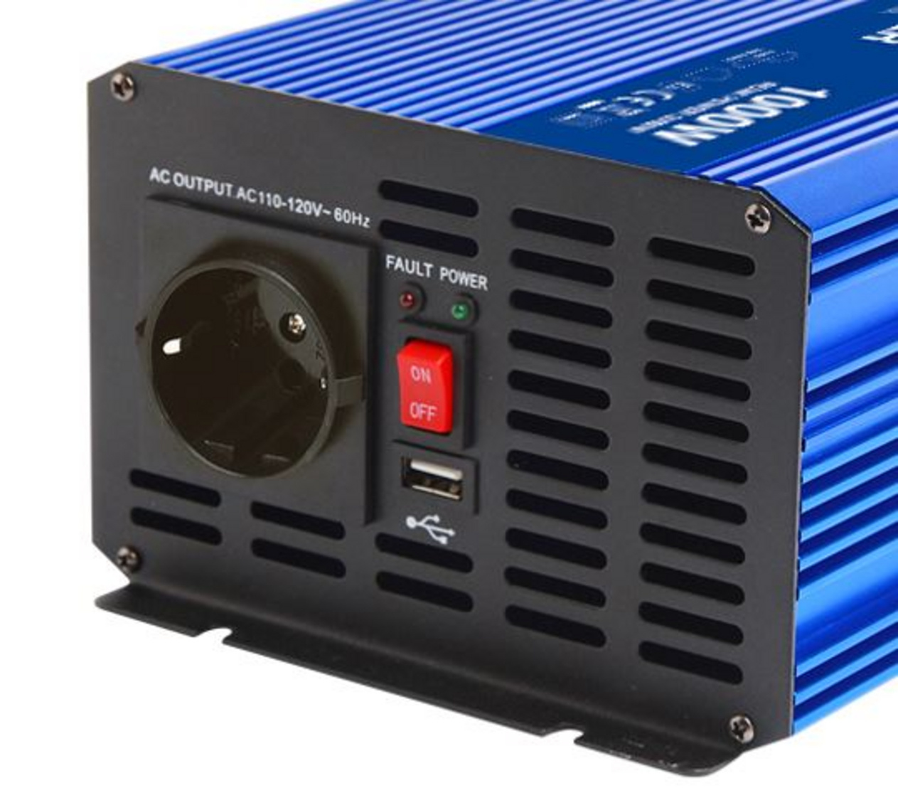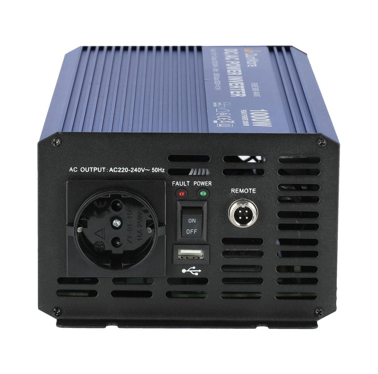 En högkvalitativ 12 V sinusvågsomvandlare som ger 1000 W kontinuerlig effekt. Förutom Schuko-kontakten har växelriktaren en USB 5V 2,1A-kontakt och en port för fjärrkontroll (medföljer ej).