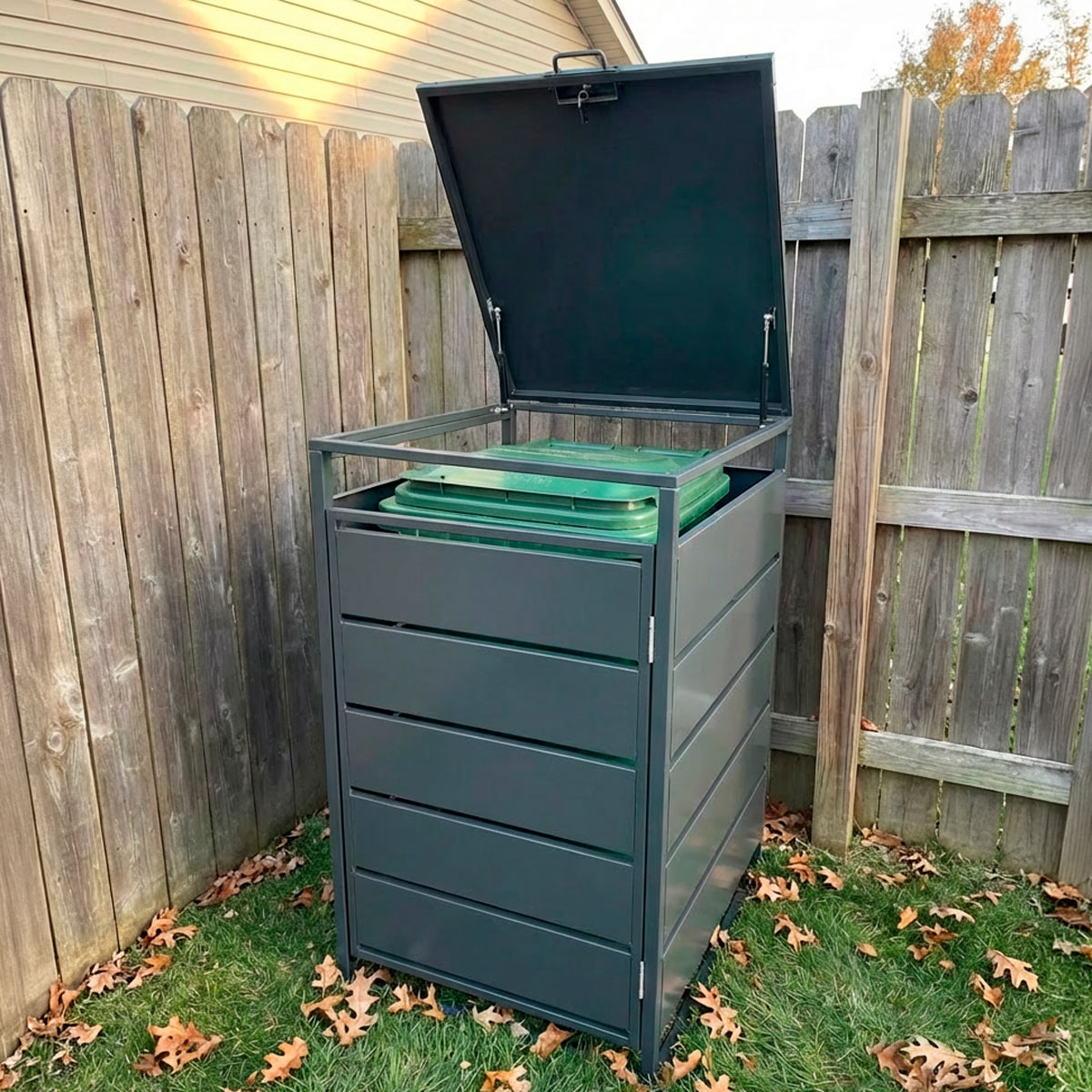Utformad för en soptunna: Noggrant anpassade mått gör att soptunneskyddet döljer en enskild soptunna snyggt och effektivt, vilket skapar ett mer organiserat intryck.