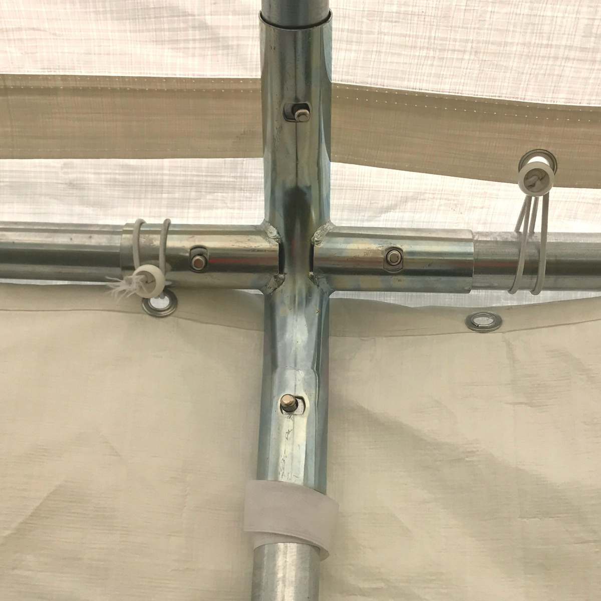 Partytältet har två stora sidoväggar med PVC-fönster, och tältets ändar har rullbara dörrar med dragkedja. Tygerna fästs enkelt på tältets metallram. Ramen är tillverkad av 38 mm tjocka pulverlackerade stålrör som står emot tidens tand.