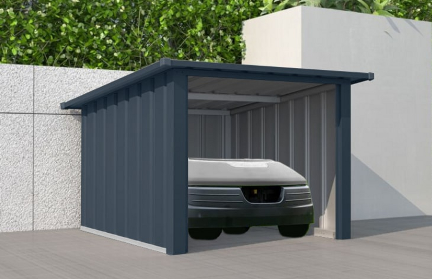 - Slutande tak och bred åtkomstöppning för gräsklipparen