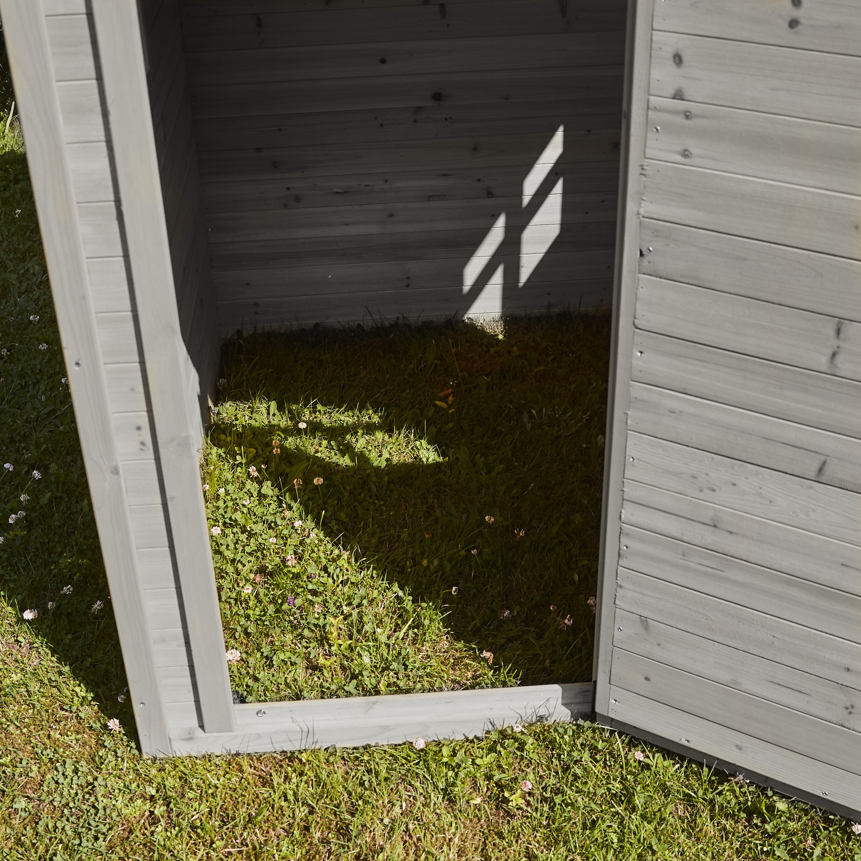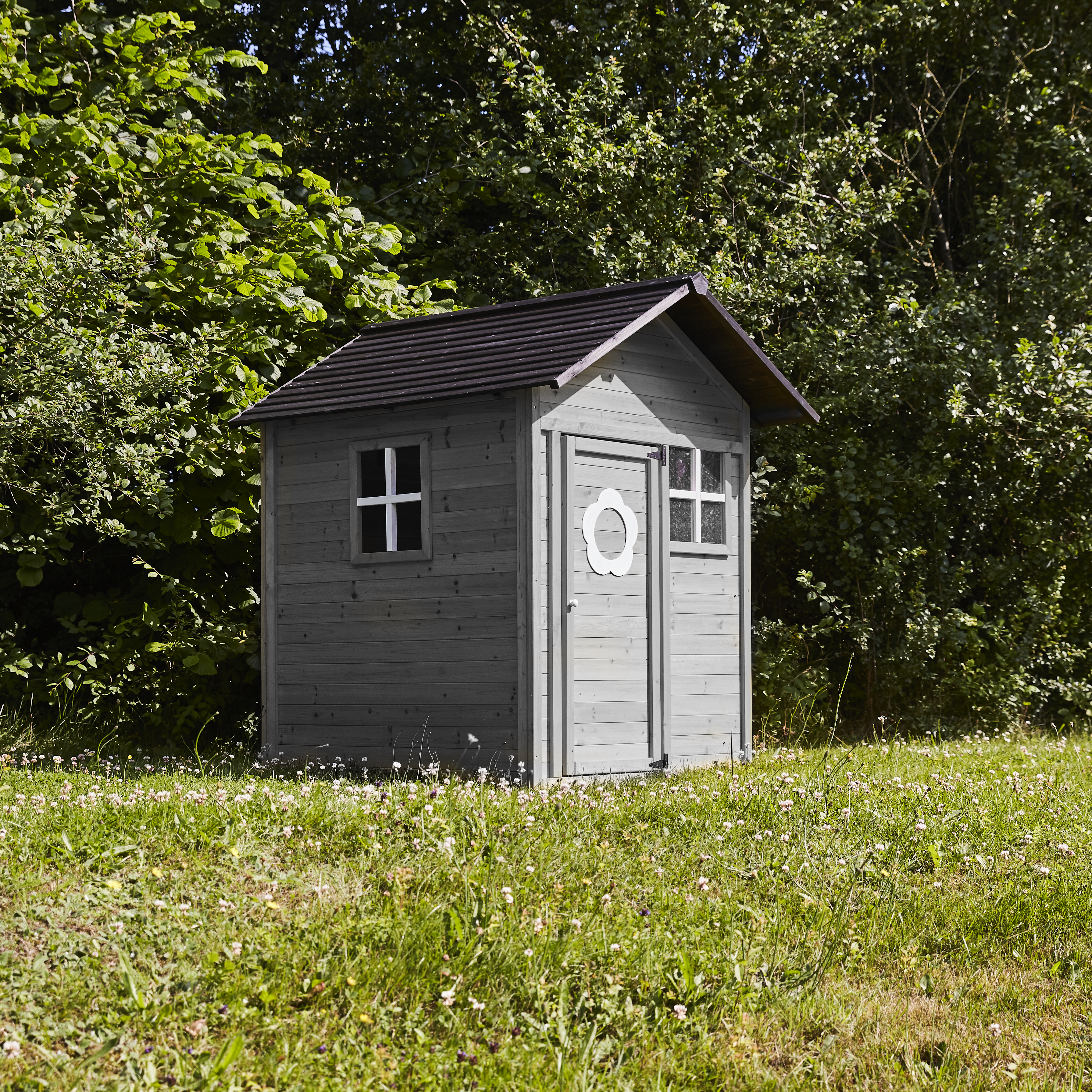 Lekstugan är gjord av 10 mm FSC-cerfifierat furu och målad i fina gråa/svarta nyanser samt behandlad med vattenbaserat träskydd, så den också kan användas utomhus. Huset är utrustat med ett robust trätak och en praktisk dörr med handtag och tre fönster, så det enkelt kan skapas lä och inomhusmys från vädret. Då kan leken fortsätta och man kan följa med i allt det spännande som händer runt om i trädgården.