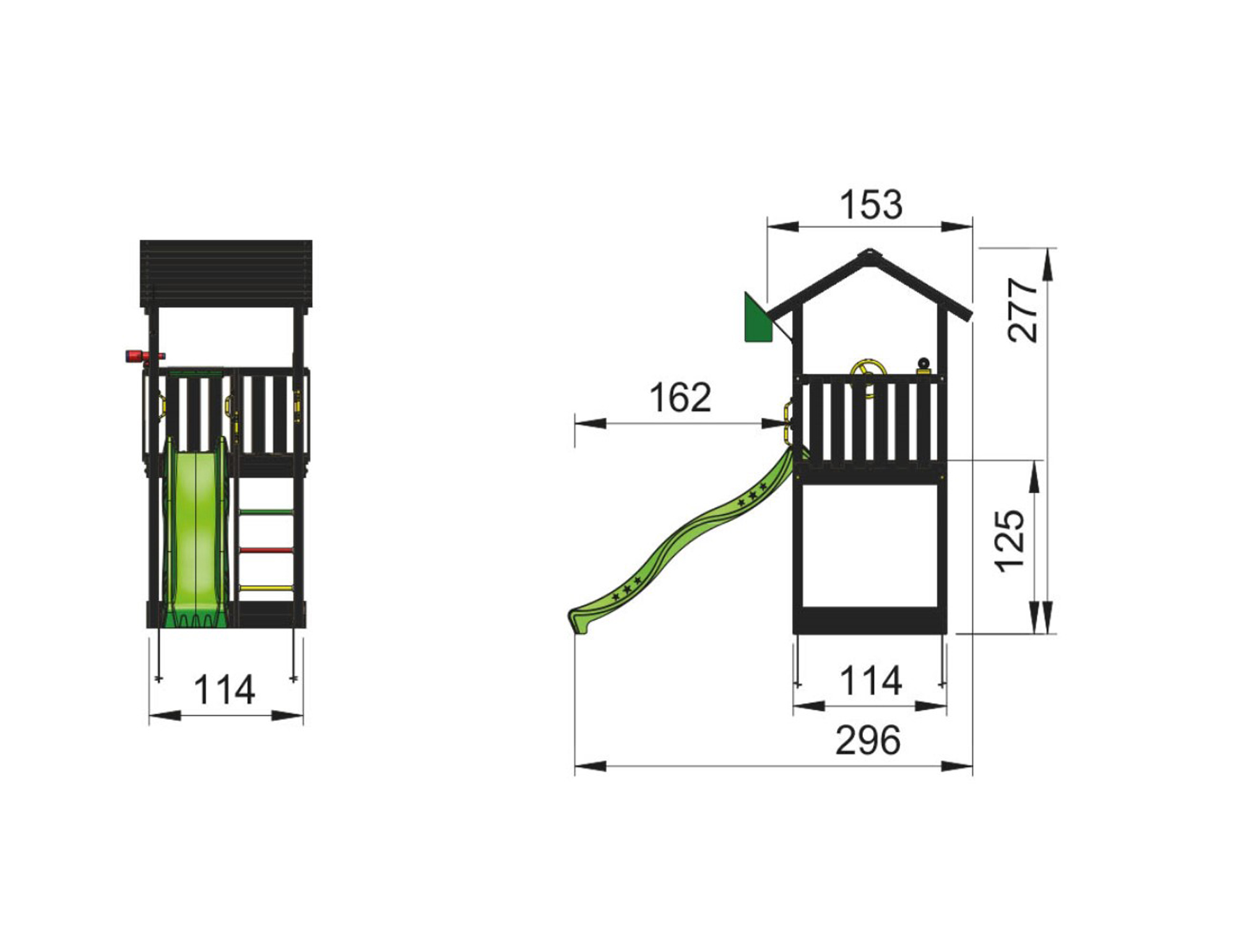 Inklusive 3-stegsstege, jordankare, borr/skruvar, beslag, skruvskydd, handtag, stjärnkikare, ratt, Jungle Gym-flagga, huvudskydd, grön rutschkana 220 cm och sandlåda.