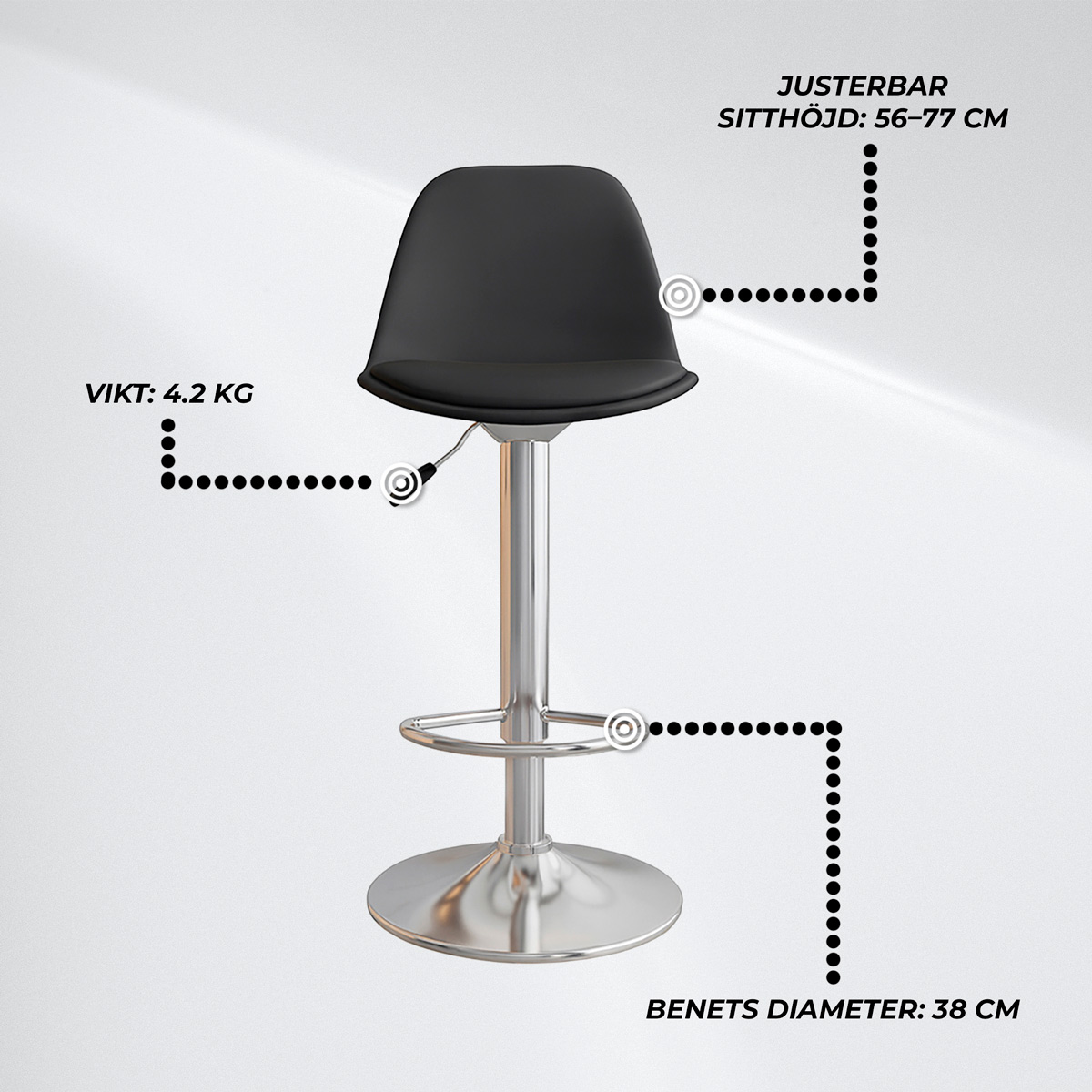 <li><strong>Justerbar sitthöjd:</strong> Anpassa enkelt höjden från 56 till 77 cm för att matcha din bar eller köksö.</li>