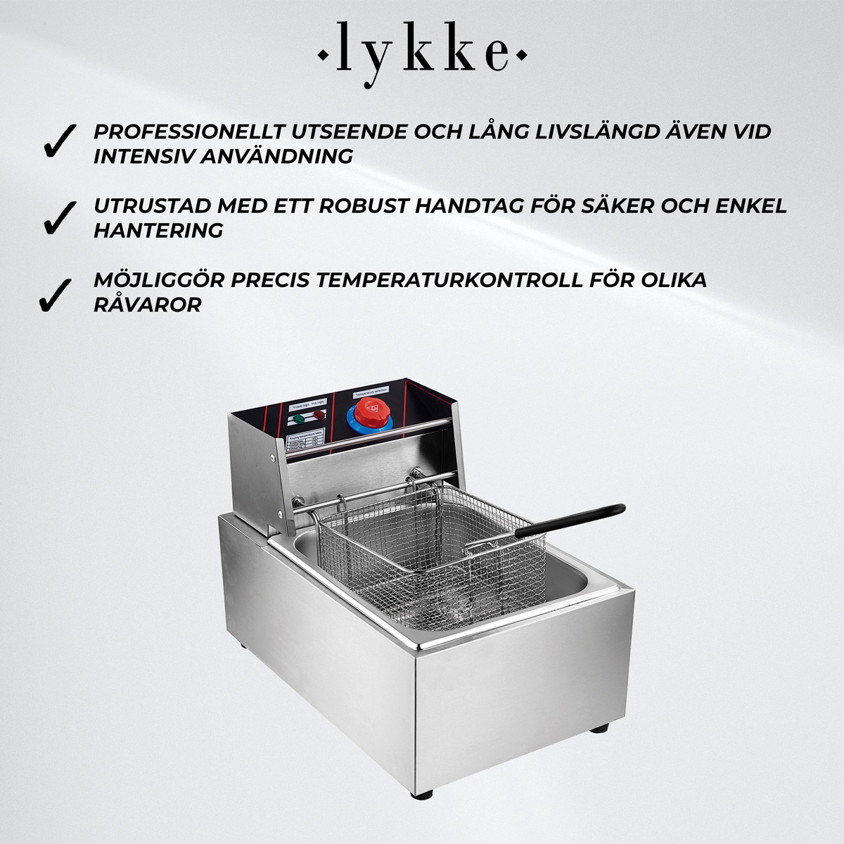 <p>Upplev exceptionell fritöskapacitet med Lykke Fritös 6 L, 2.5 kW. Denna robusta och effektiva fritös är idealisk för både hemmakockar och professionella användare som eftersträvar perfektion i fritering. Med en kropp helt i rostfritt stål och avancerade funktioner, levererar denna maskin inte bara hög prestanda men även säkerhet och enkel användning. Den justerbara termostaten tillåter exakt temperaturkontroll, medan det inbyggda oljeavloppet och den snabba uppvärmningen sparar både tid och energi. Förvandla ditt kök till ett professionellt friteringsområde med Lykke Fritös 6 L.</p>