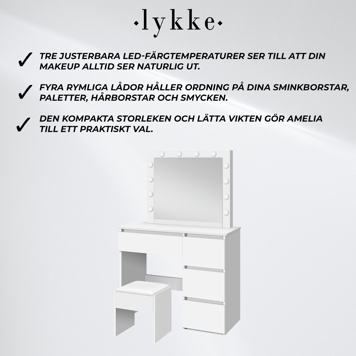 </ul><h4>Varför välja Lykke Sminkbord med belysning Amelia 94cm, vit?</h4>