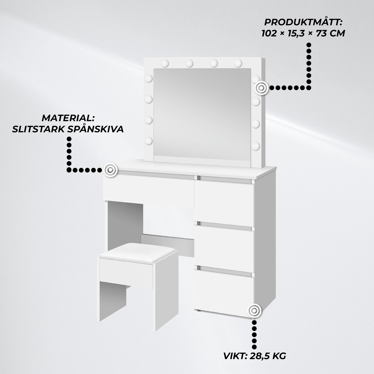 Mångsidig användning – fungerar som sminkbord, toalettbord och spegelbord. Perfekt belysning – tre justerbara LED-lägen för alla ljusmiljöer. Praktisk förvaring – fyra lådor håller dina produkter organiserade. Komplett set – sminkpall ingår för en färdig helhet. Hållbar och lätt – robust konstruktion i spånskiva, enkel att flytta. Tidlös design – vit färg som passar alla inredningsstilar. Bekväm användning – optimal höjd och belysning gör sminkningen enklare.