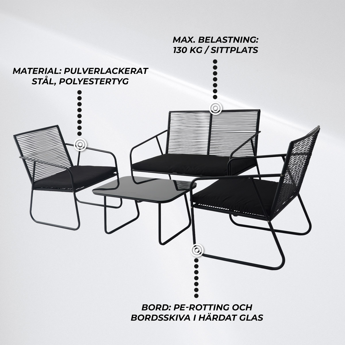<p>Lykke Utesoffgrupp Skagen erbjuder en kombination av stil, komfort och hållbarhet, vilket gör den till ett utmärkt val för din uteplats eller trädgård. Med en robust ram i pulverlackerat stål och en maximal belastningskapacitet på 130 kg per säte, är denna <strong>loungeset</strong> designad för att tåla både vikt och väder. Sittytorna i polyester och bordsskivan i härdat glas ger inte bara en attraktiv finish utan är även vattentäta och väderbeständiga, vilket säkerställer att din <strong>loungegrupp</strong> ser bra ut år efter år.</p>