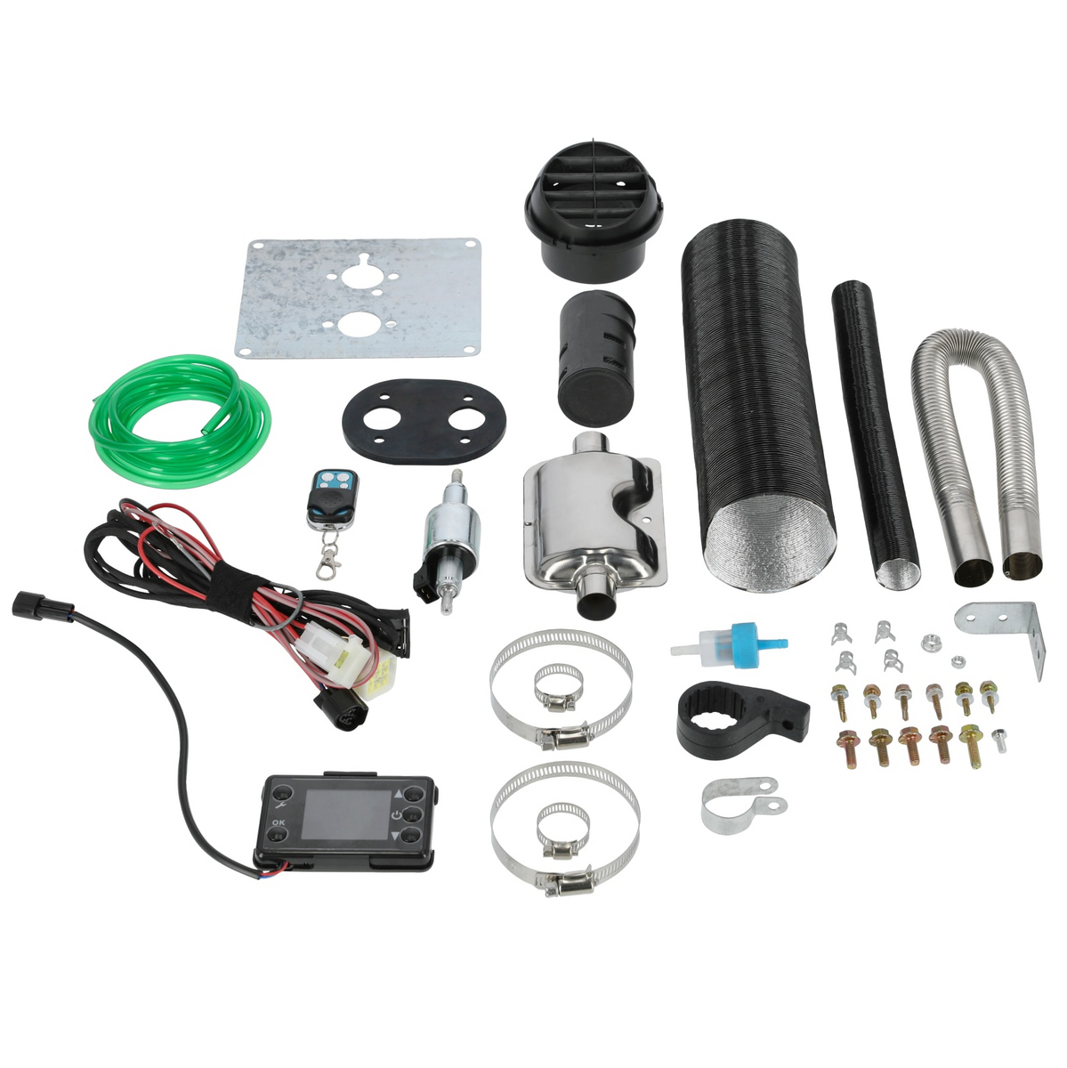 Värmarenhet med kontrollpanel, Fjärrkontroll, Luftfilter, Luftrörsskärm, Ljuddämpare, Elkablar, Bottenplatta, Bränslepump, Bränsleslangar, Luftintags- och luftutloppsslangar, Klämmor och skruvar, 5 liters bränsletank, Avgasrör"5kW värmare med fjärrkontroll