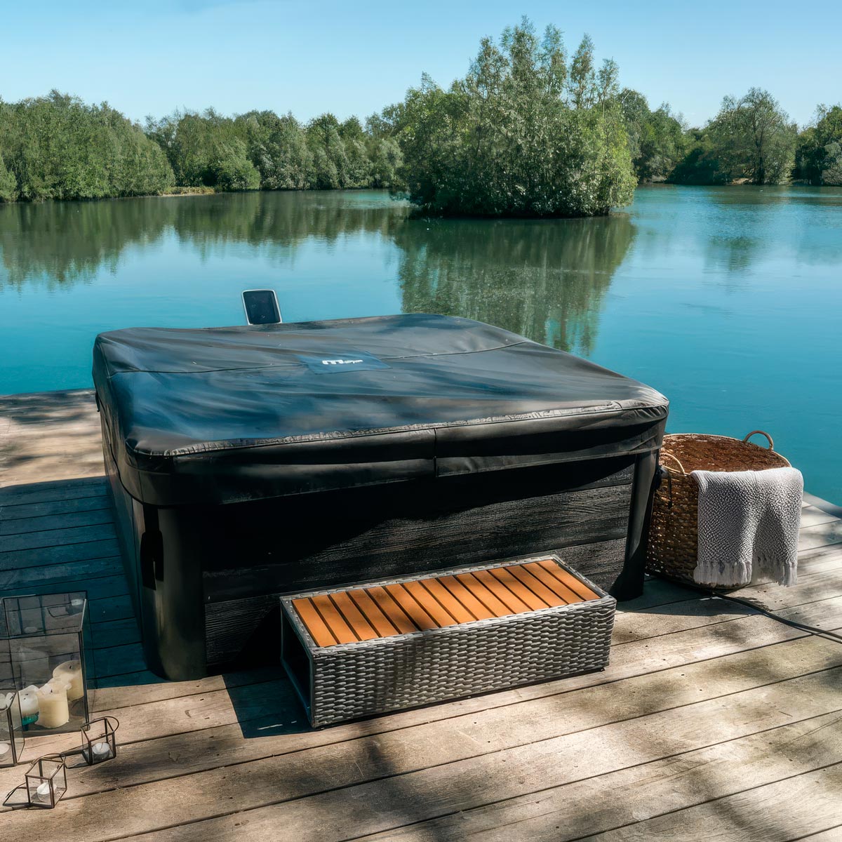 Badets yttre panel är klädd i mörkgrå träimitation som smälter vackert in på terrassen eller i trädgården. Invändigt har karet en ljusgrå, lättstädad PVC-yta som ger ett fräscht intryck. Trots att ramen är uppblåsbar är badet mycket stabilt och robust, men ändå lätt att flytta, installera och förvara vid behov.