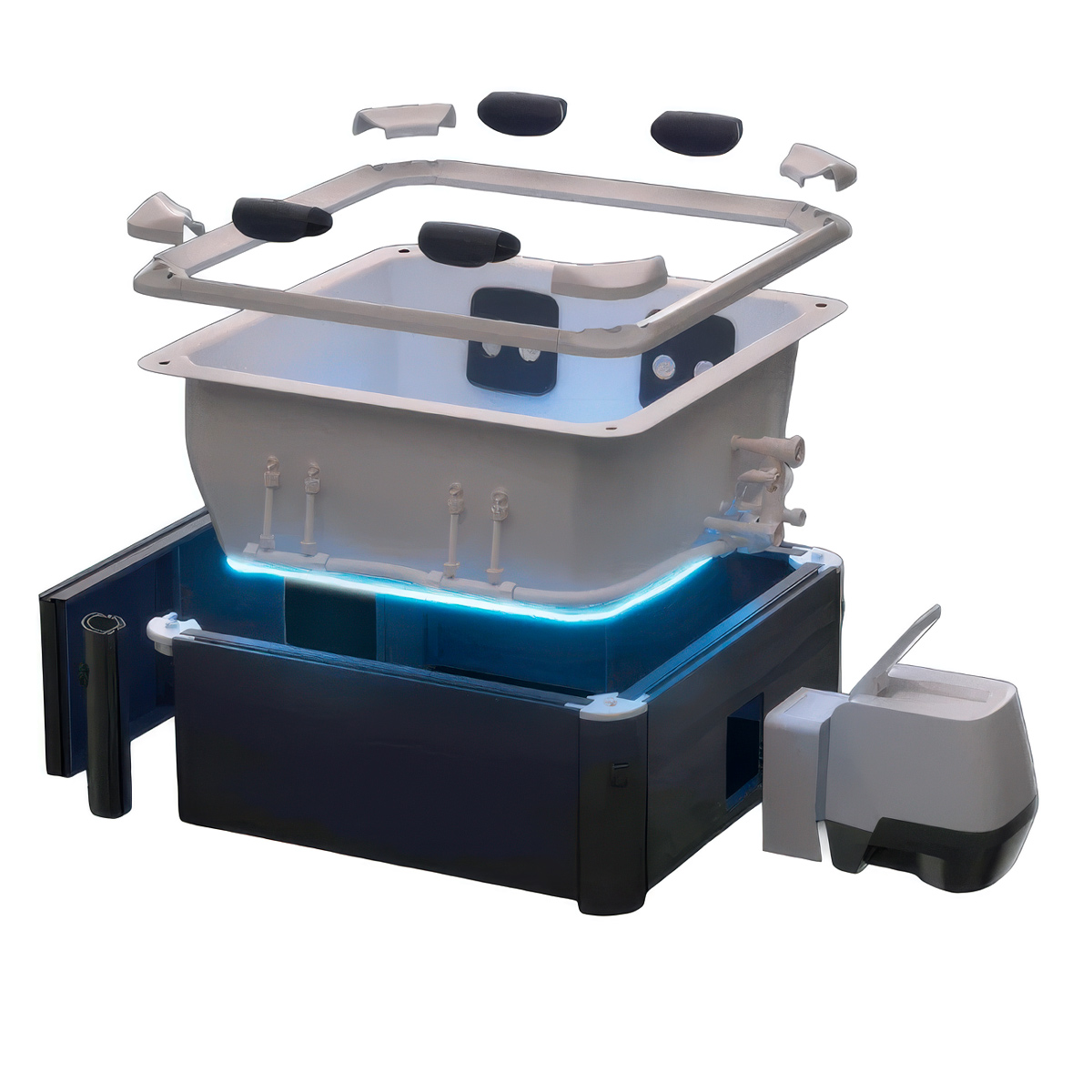Totalt 140 luftmunstycken och justerbara vattenstrålar gör badupplevelsen extra avslappnande. Under mörka kvällar skapar den LED-list som monteras längs badets nedre kant en stämningsfull belysning. Komforten ökas ytterligare med de medföljande nack- och ryggstöden samt de integrerade sittplatserna.