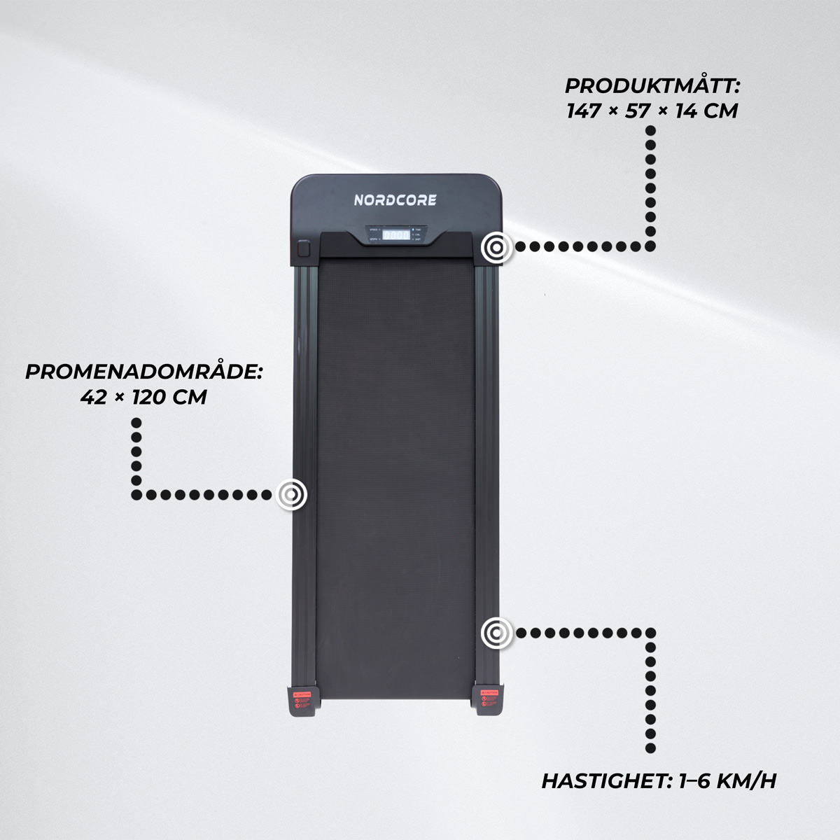 Justerbar hastighet 1–6 km/h: Anpassa träningen från lugn promenad till rask powerwalk.