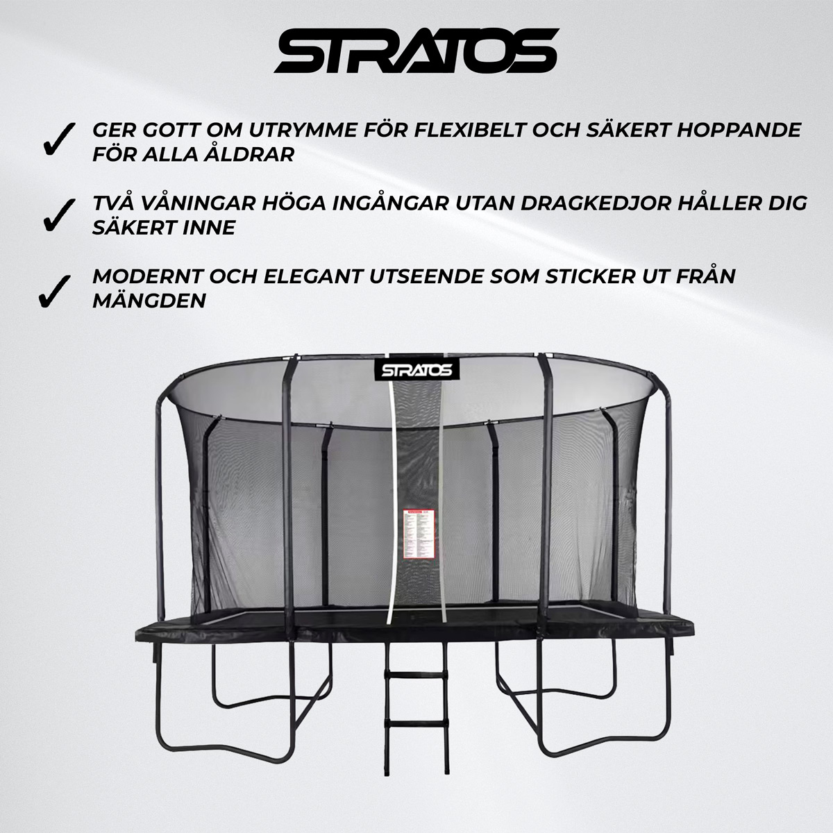 Stratos Rectangle Studsmatta 277x477 cm Premium Black Line erbjuder en utmärkt hoppupplevelse med fokus på säkerhet och hållbarhet. Den rektangulära trampolinen är det perfekta valet för alla som vill njuta av trampolinen länge och på ett säkert sätt.