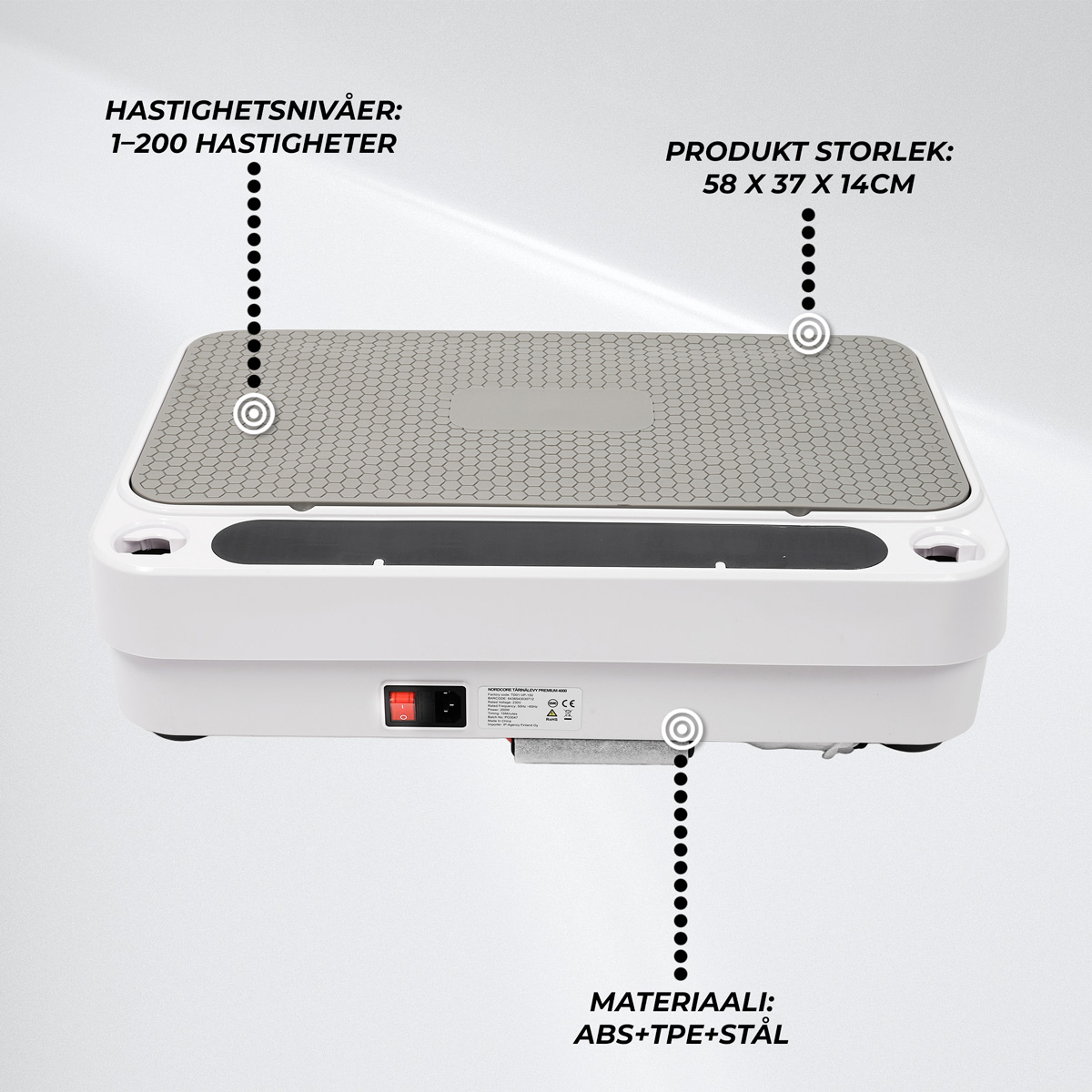 <li><strong>Omfattande vibrationsfunktioner:</strong> Med 200 nivåer av hastighetsjusteringar och oscillerande vibrationstyp, erbjuder denna platta en mångsidig träning som passar alla fitnessnivåer.</li>