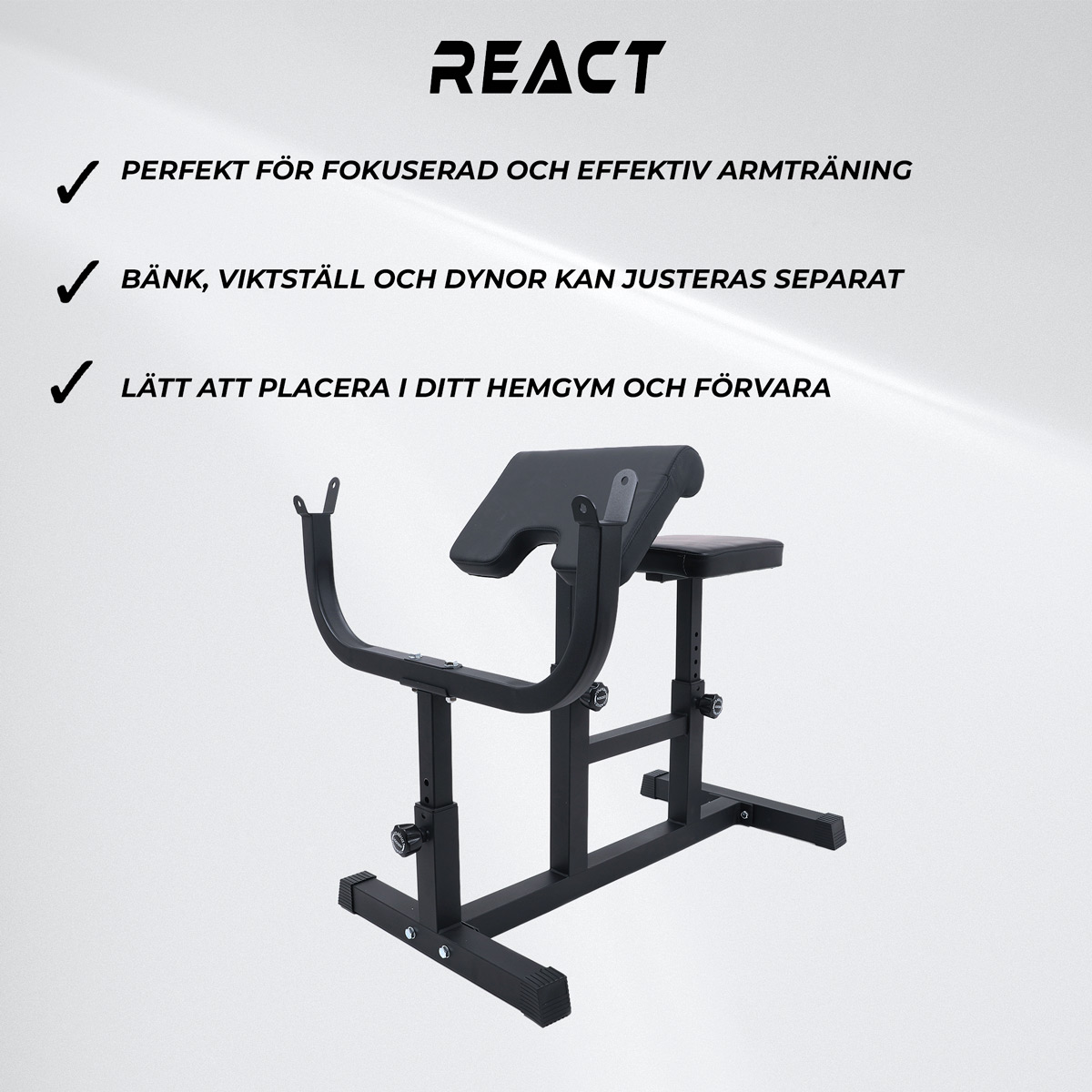 <p>Genom att införliva en curlbänk i ditt hemmagym skapar du en grund för en effektiv och målmedveten armträning. Dessa bänkar är inte bara praktiska utan också en långsiktig investering i din hälsa och fysiska kapacitet.</p><h4>Varför välja React Curlbänk 100?</h4>