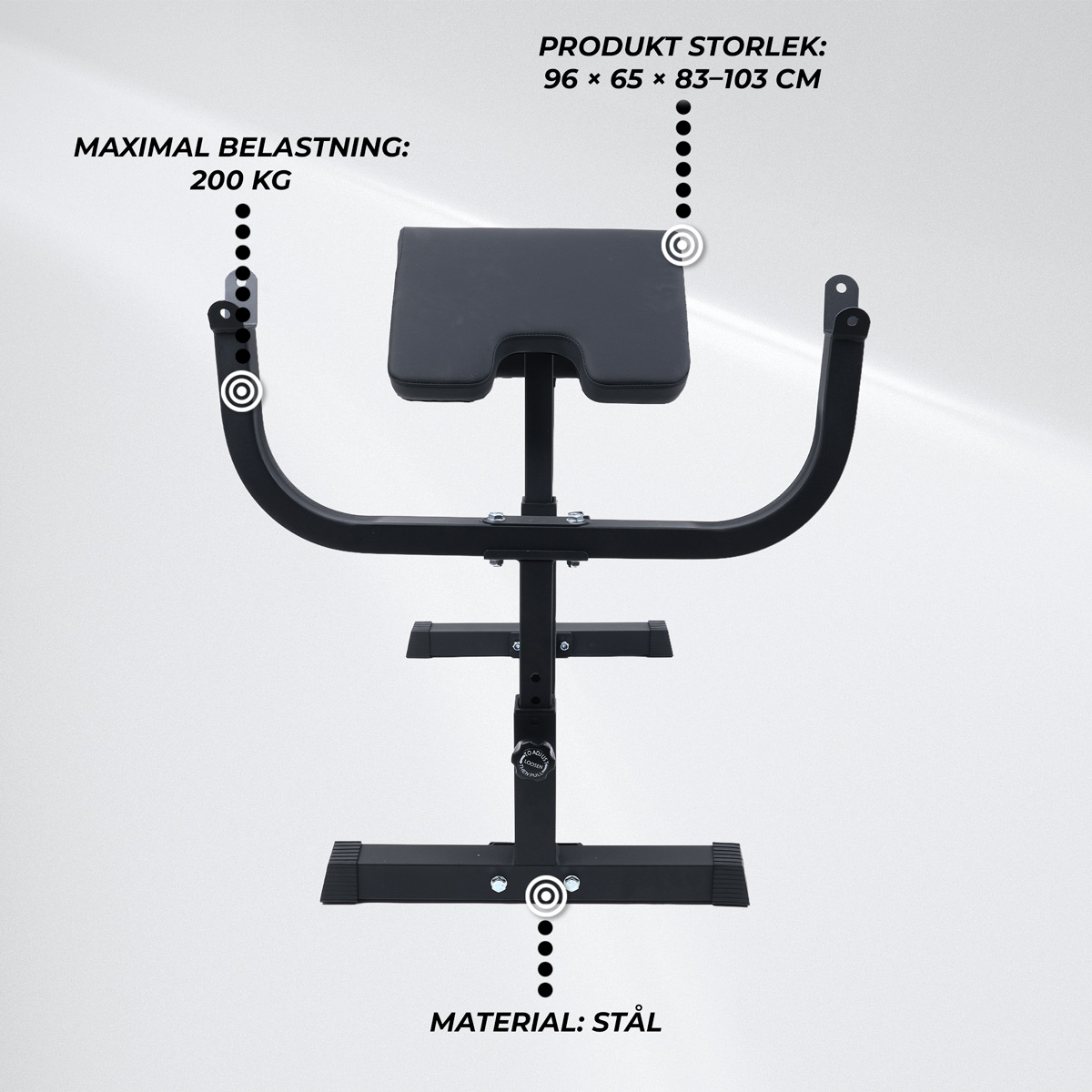 <li>Höjd: justerbar (bänk, viktställ, stoppning justeras separat)</li>