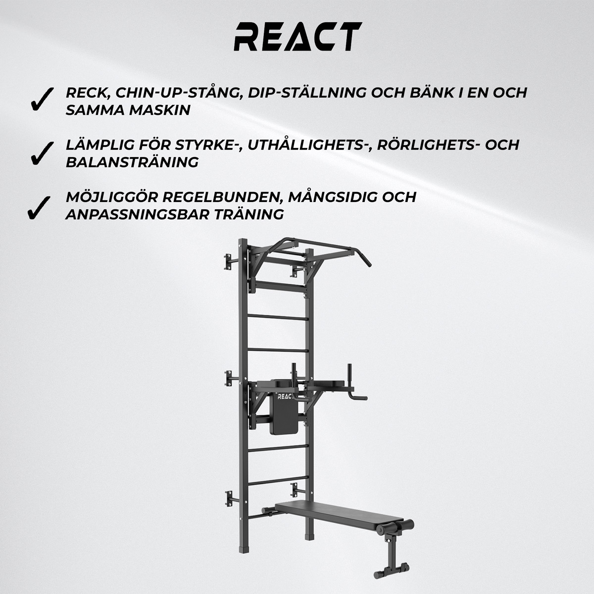 <p>Med React Ribbstol/Fitness Tower får du en komplett träningslösning som effektivt kombinerar funktionalitet och hållbarhet i ett och samma redskap. Denna mångsidiga fitnessstation är utformad för att ge plats åt allt från styrketräning och kardiovaskulär träning till flexibilitets- och balansövningar, allt detta på en yta av endast 230x149x98 cm i ditt eget hem.</p>