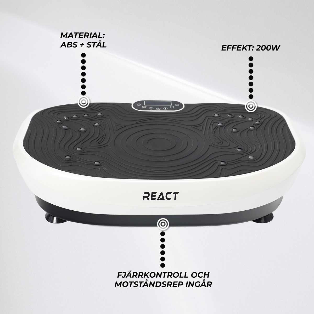 Den kraftfulla 200-wattsmotorn ger jämn och stark vibration. Detta gör React Vibrationsplatta 1000 till ett pålitligt val för både intensiva pass och lättare användning.