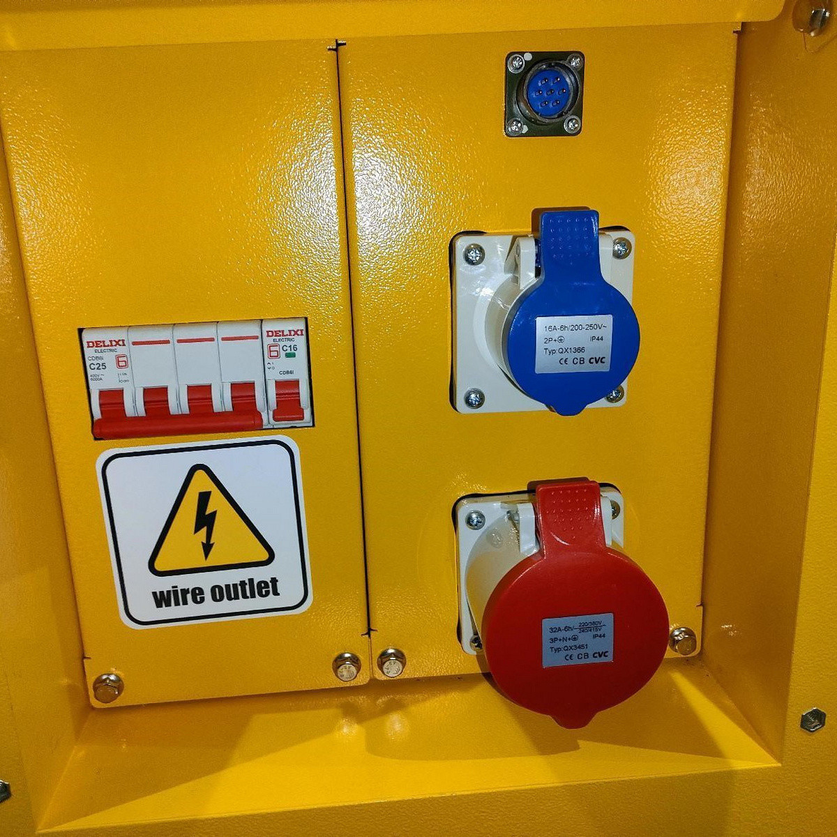 - Utgångar 16A 230V 1-fas: 1 st husvagnskontakt CEE