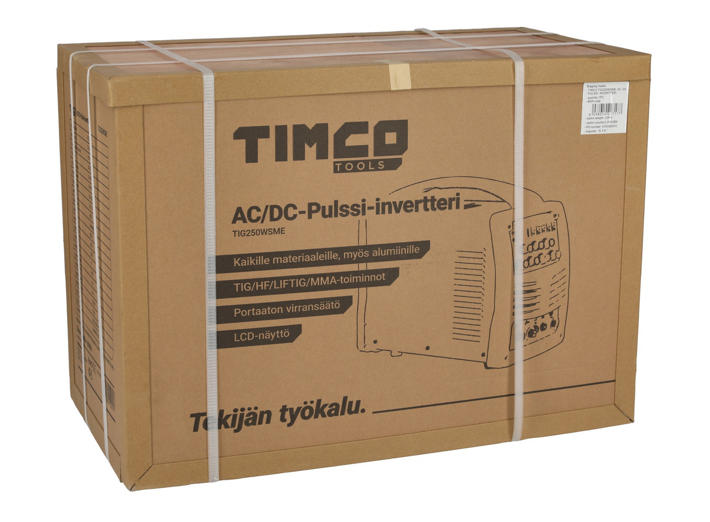 Timco TIG250WSME är en ny AC/DC pulsväxelriktare som är en lätt, portabel och riktigt kompakt TIG-svetsmaskin. Den är lämplig för lätt industritillverkning, underhåll och reparation, jordbruk och fordonsindustrin. TIG250WSME är designad för högkvalitativ TIG-svetsning. Med denna TIG-svetsmaskin kan du svetsa nästan alla typer av metaller, t.ex. stål, rostfritt stål, krom, titan och aluminium! När förhållandena inte gynnar TIG-svetsning kan du alltid byta stickkablarna och göra jobbet med en sticka.