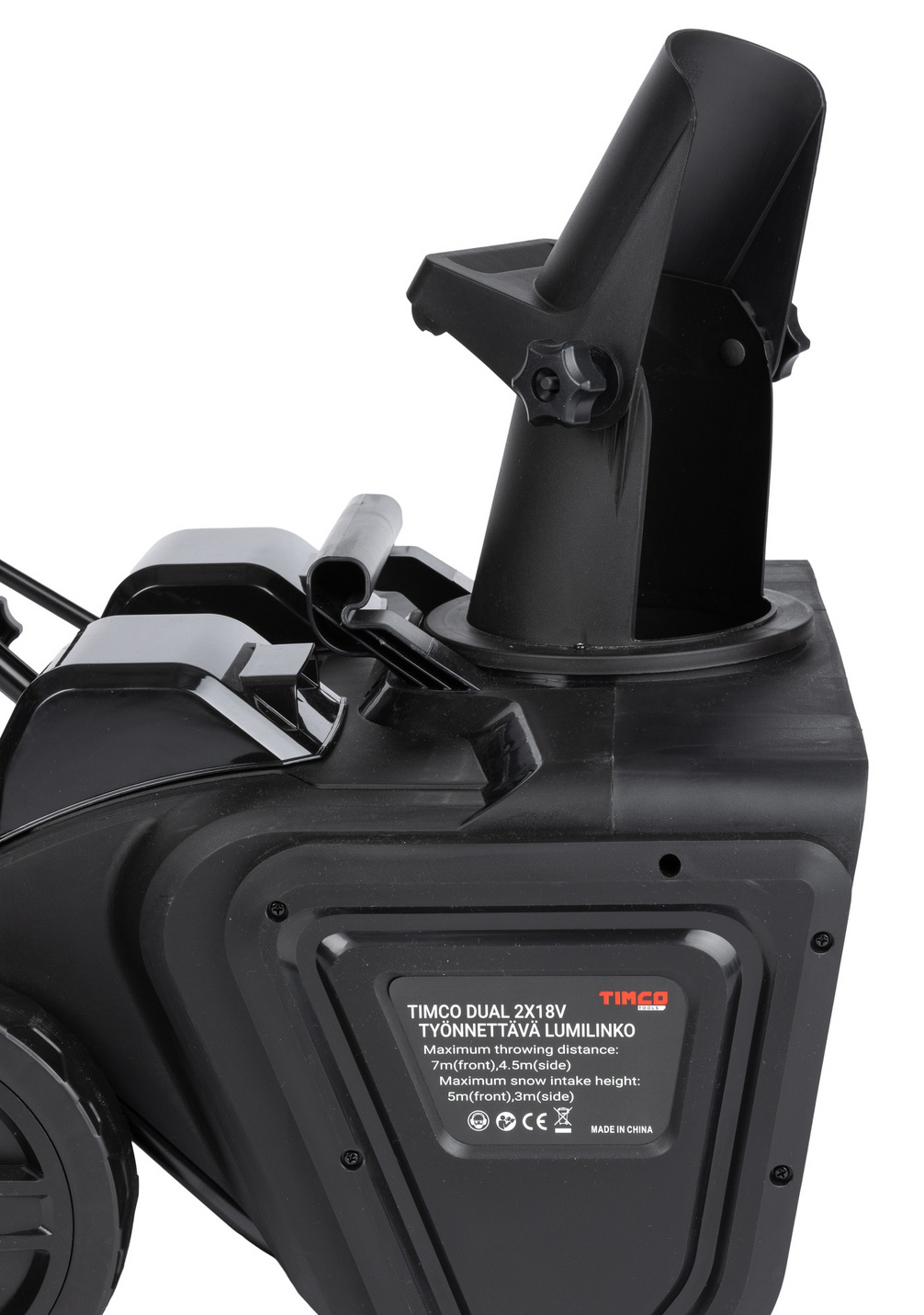 Den 180-gradigt justerbara snökastrotorn gör att du alltid kan kasta snö på samma ställe, oavsett vilken ände av gården du startar från. Justering av kastrotorn på tryckhandtaget.