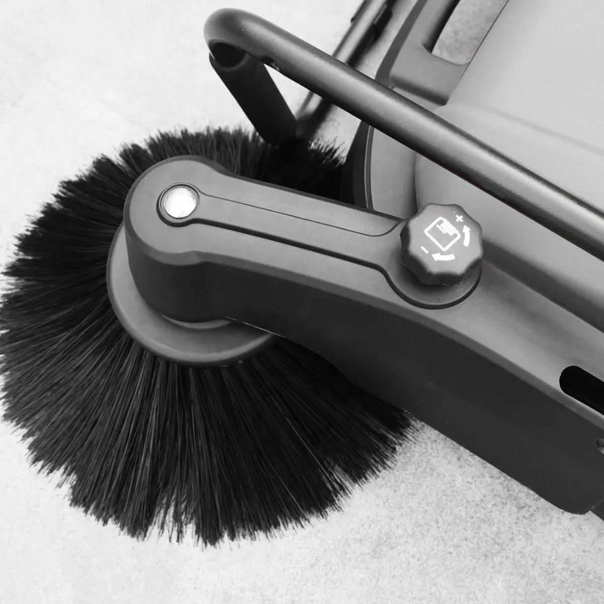 - Ergonomisk och anpassningsbar: steglöst justerbart tryckhandtag och höjdjusterbara sopborstar (sidoborstar och bottenborste) som kan justeras för att passa olika underlag och material