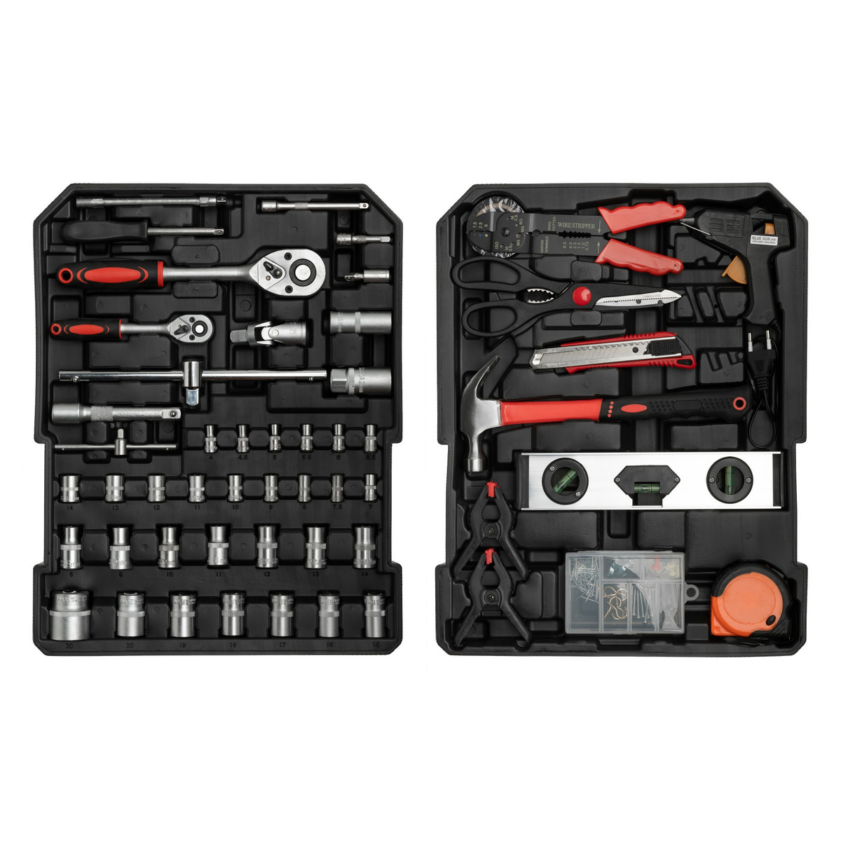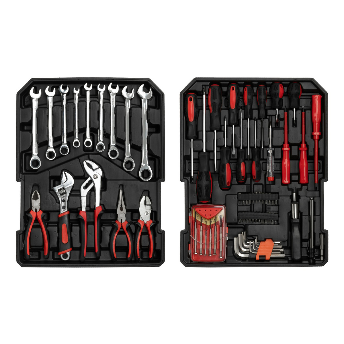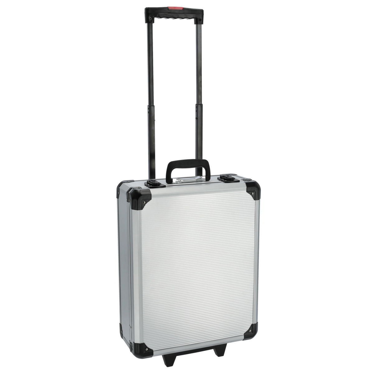 Förvaringslådan är tillverkad av aluminium och har ett teleskophandtag för de tillfällen då du behöver ta med dig verktygen till användningsstället. Verktygen är mycket tätt packade för enkel förvaring. Varje verktyg har sin egen markerade plats i väskan. Innehåller hylssats, listnyckelsats, klämmsats, skruvmejselsats, sexkantsats, spetsats, skruvmejselpass, fästelement, måttband och andra enskilda verktyg. Verktygen är värmebehandlade för att avsevärt förbättra hållfastheten och verktygens livslängd. Värmebehandlingen har en hållfasthet på 45. Skiftnycklar och hylsor i 45-gradigt värmebehandlat stål med låg kolhalt, spärrhakar och spetsar i krom vanadin.
