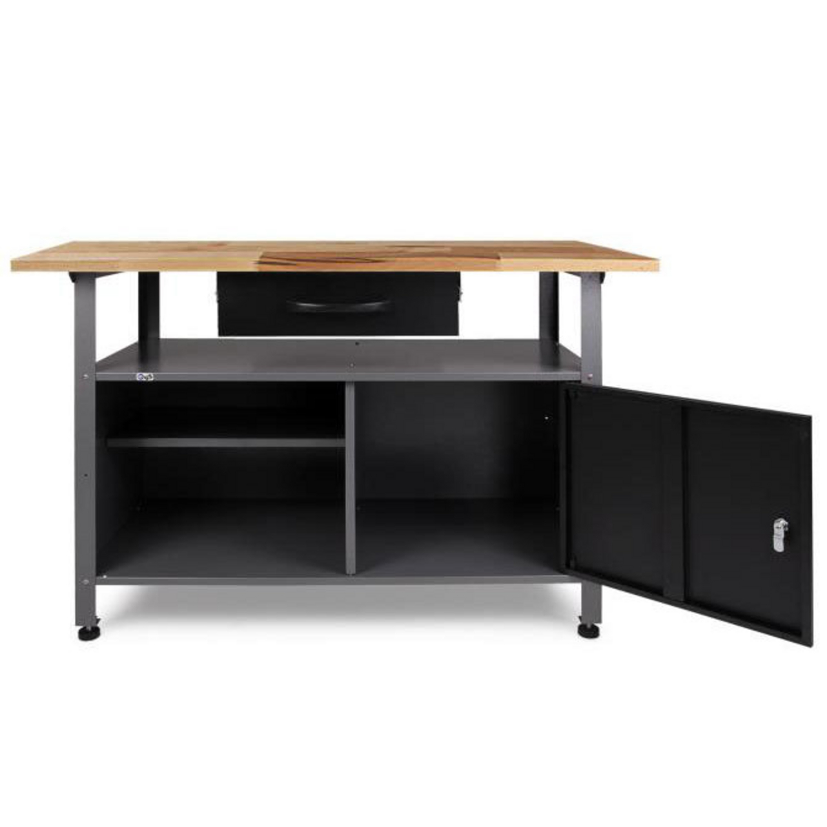 En prefabricerad enhet för stall, verkstäder och lager, med en robust stomme och kullagrade lådor. En grupp enheter med ett högt tillbehörsskåp, tre små skåp och en låda. Bordsramen är tillverkad av pulverlackerat stål och bordsskivan är tillverkad av slitstark spånskiva laminerad i trä.