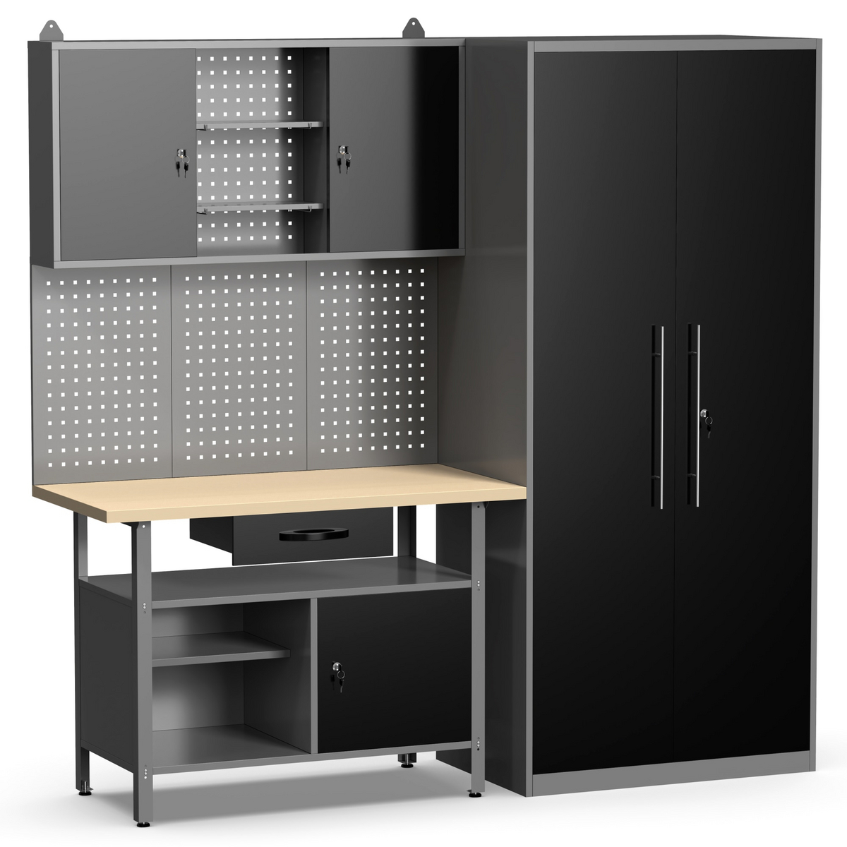 Mellanrummet är fyllt med perforerade panelväggar där krokar, ställningar, nivåer etc. för verktyg och tillbehör kan installeras om så önskas. Högskåpet och de tre mindre skåpen är alla låsbara. Två nycklar medföljer.