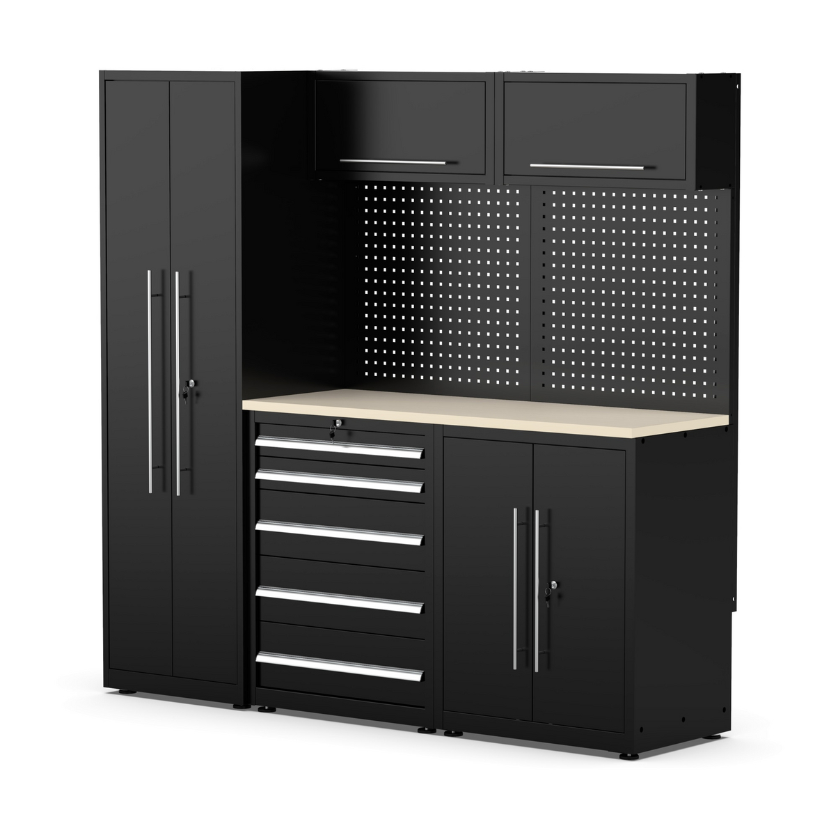 Mellanrummet är fyllt med perforerade panelväggar där du kan montera krokar, ställningar, nivåer etc. för verktyg och tillbehör. Högskåpet, lågskåpet och lådan är alla låsbara. Två nycklar ingår i leveransen.