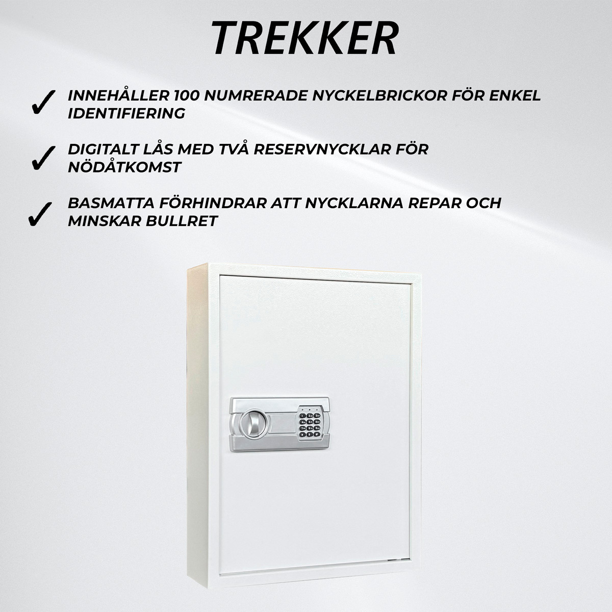 <p>Uppgradera din säkerhet och organisering med det toppmoderna Trekker Nyckelskåp. Perfekt för företag, hotell eller andra institutioner där säker och tillgänglig nyckelförvaring är essentiellt. Trekker Nyckelskåp med kodlås 100 är inte bara en funktionell lösning, utan också en snygg tillägg i vitt utförande. Med plats för upp till 100 nycklar och utrustad med ett digitalt lås som inkluderar två override-nycklar, erbjuder detta nyckelskåp optimal säkerhet och användarvänlighet.</p>