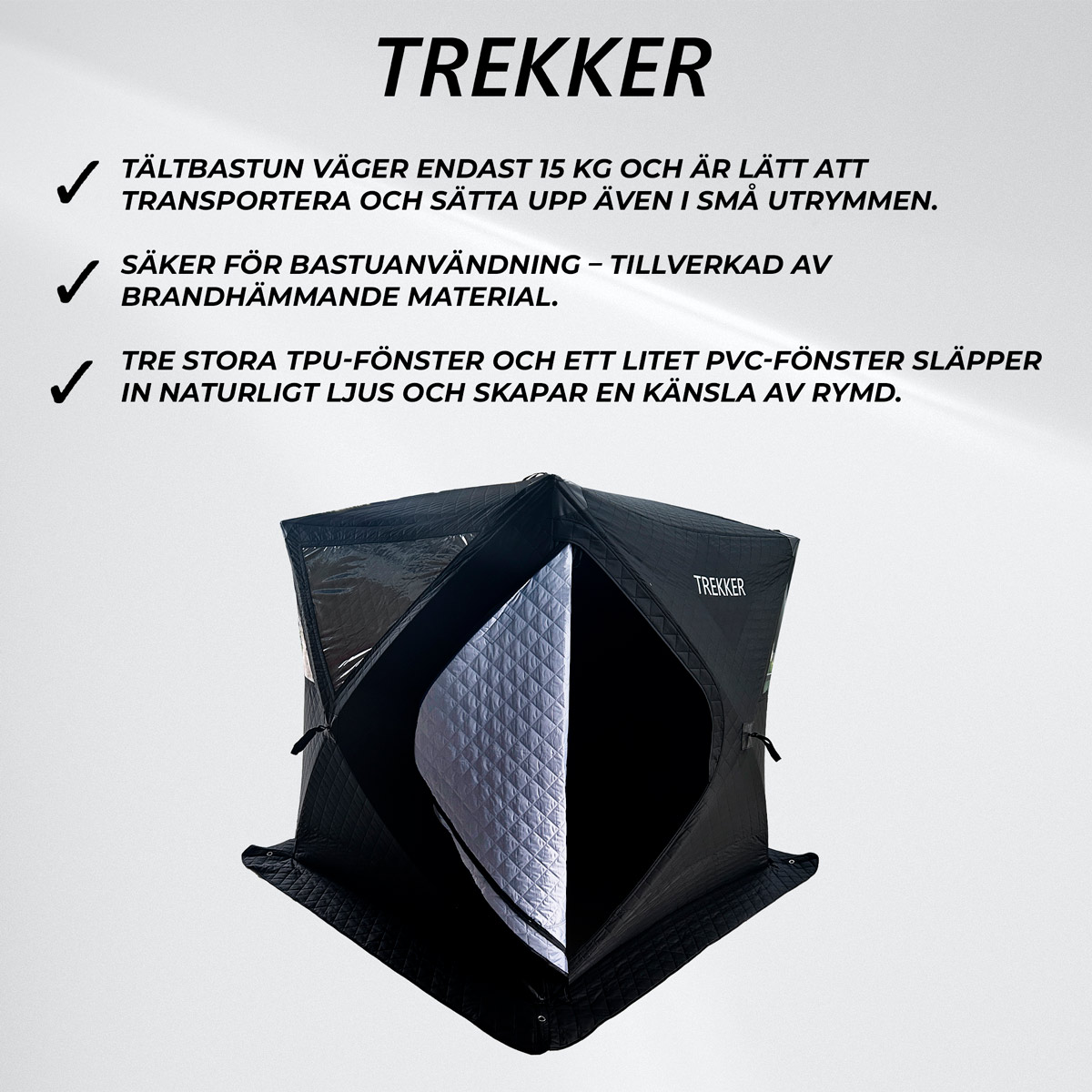 <ul> <li>Kompakt och lätt att ta med – perfekt för utflykter och stugresor</li> <li>Hållbara och brandsäkra material garanterar säker användning</li> <li>Skapa en autentisk bastuupplevelse var som helst utomhus</li> </ul> TrekkerSvart